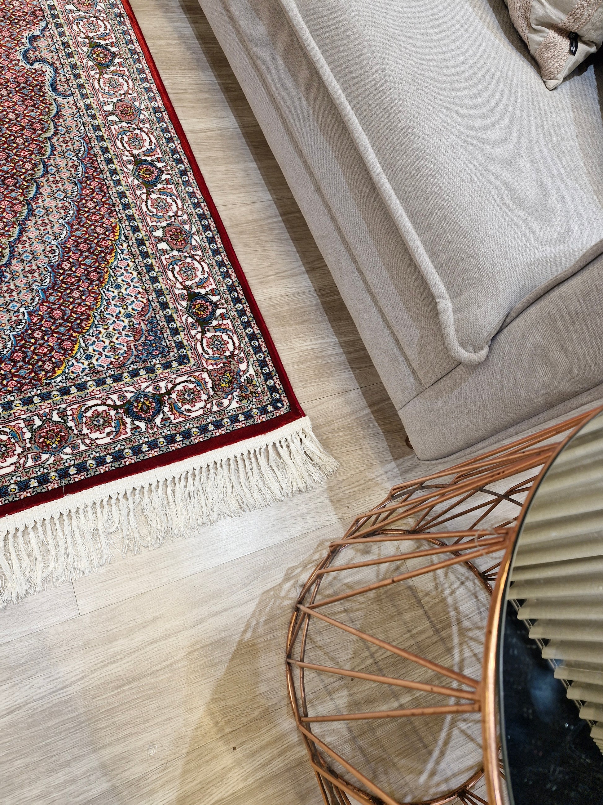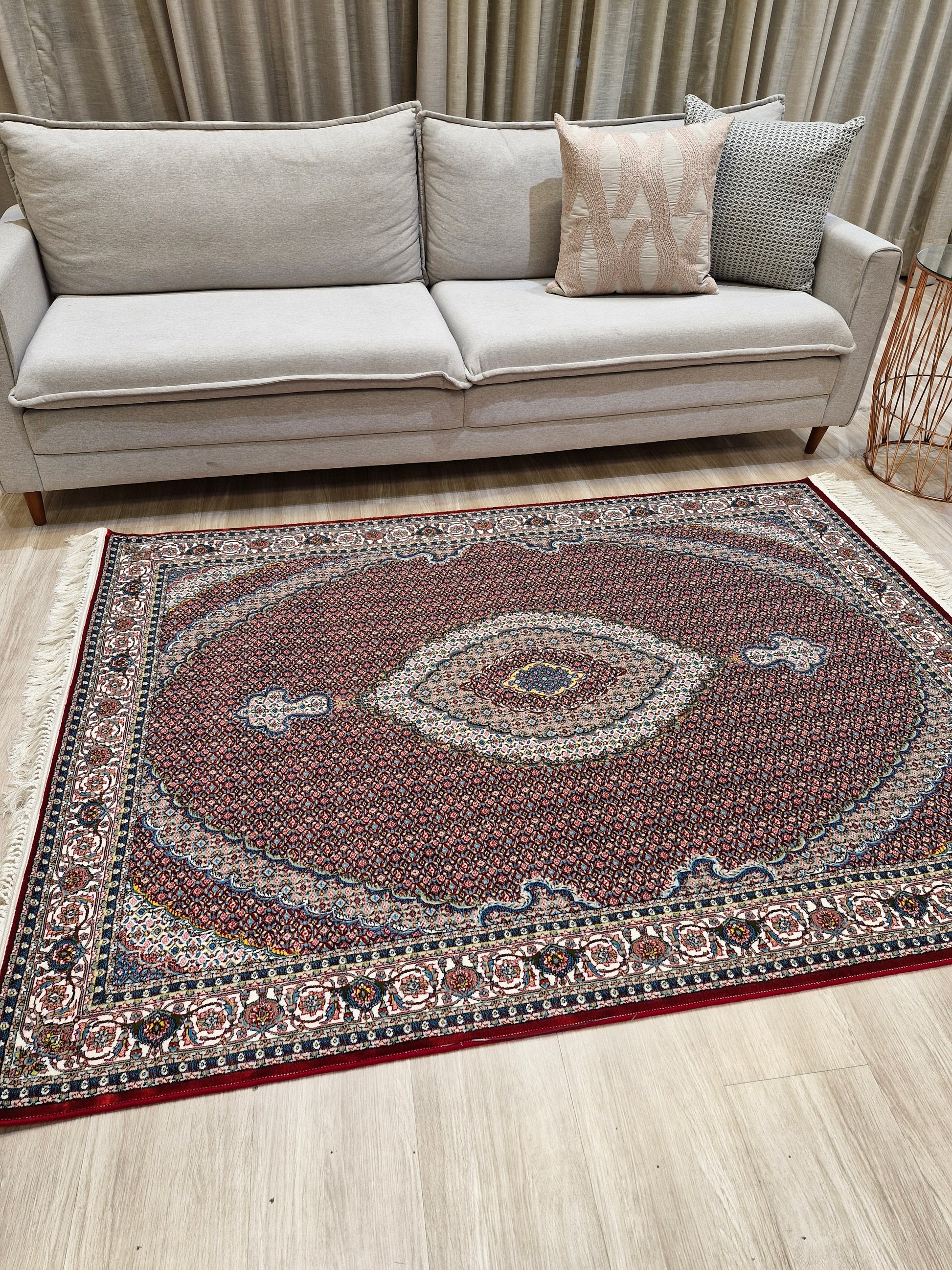 Ambientes com sofás neutros, madeira clara ou detalhes dourados realçam a riqueza dos padrões persas. Use-o como peça de destaque para criar um ponto focal luxuoso e acolhedor.