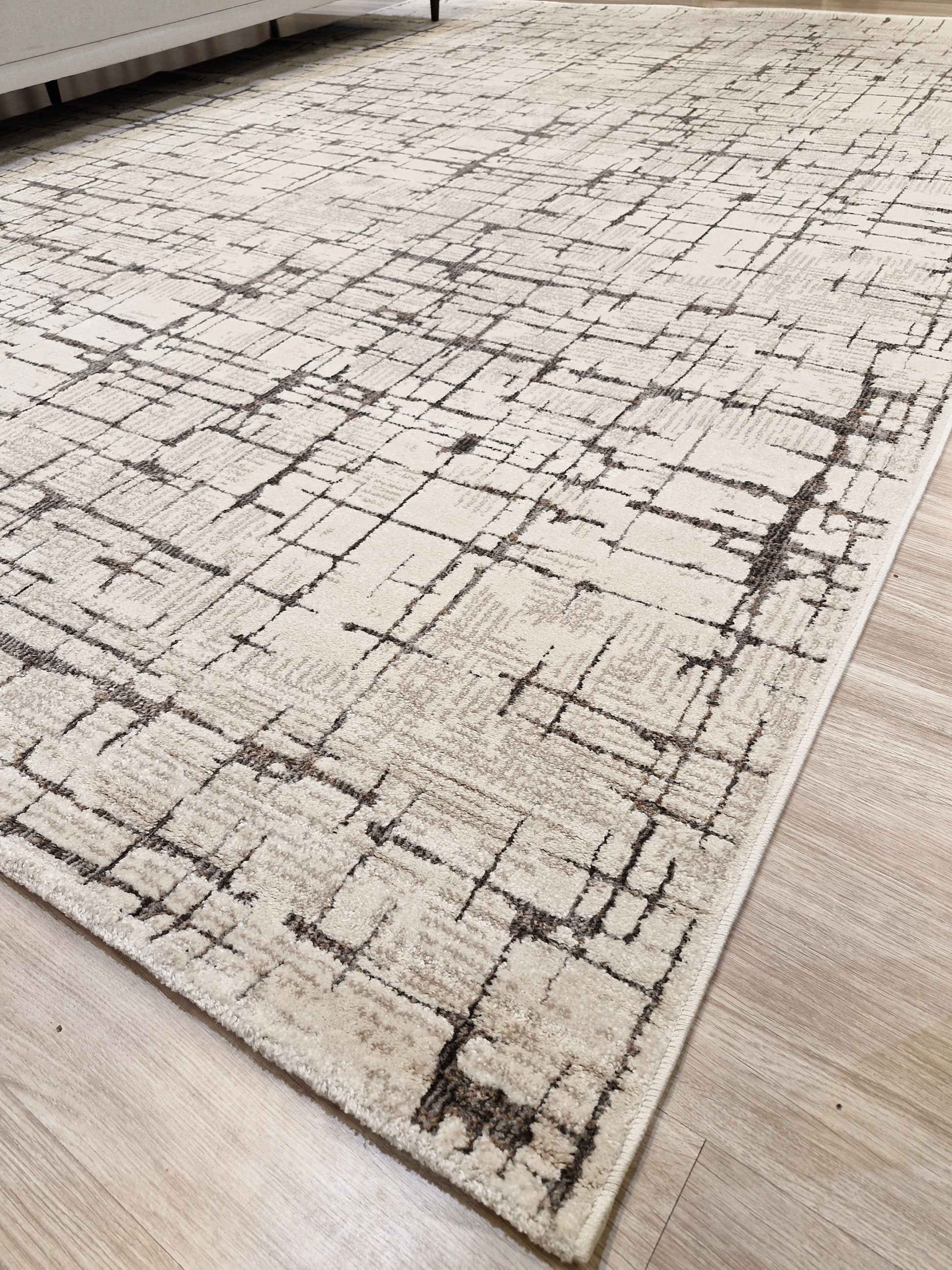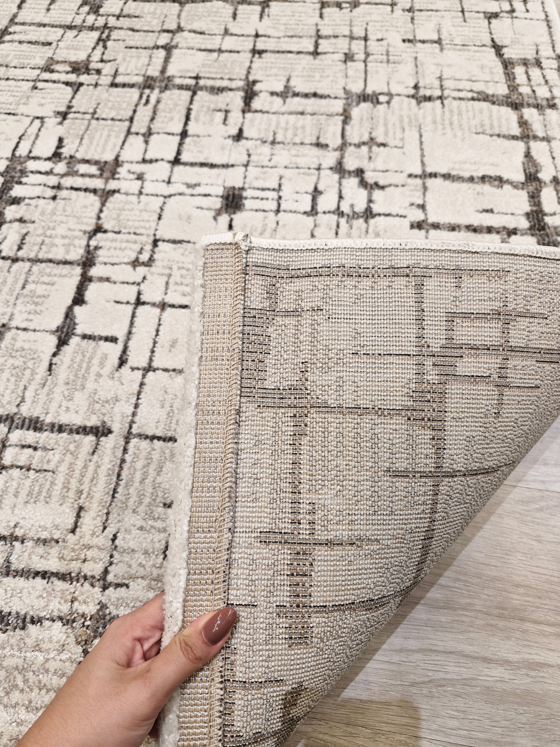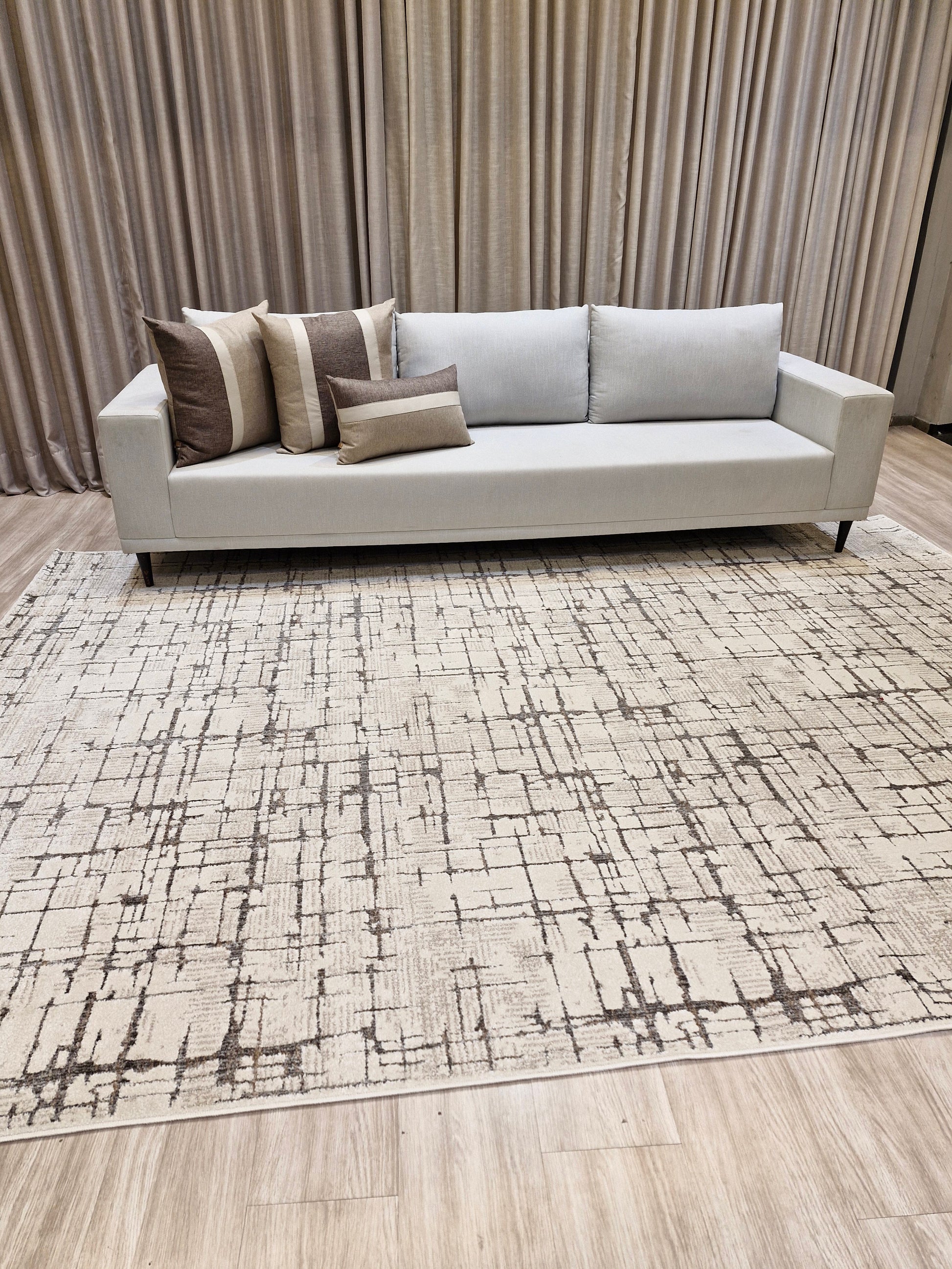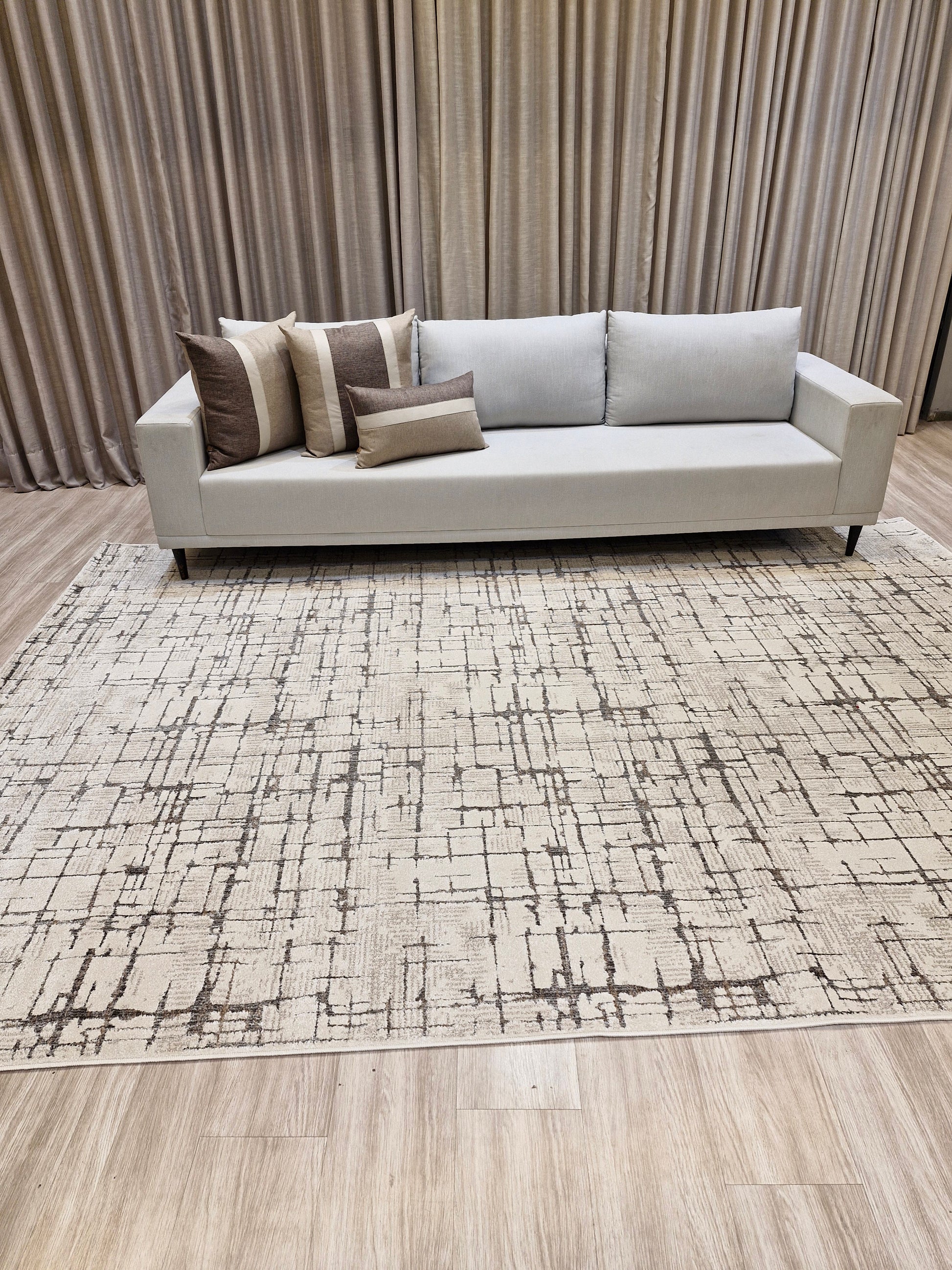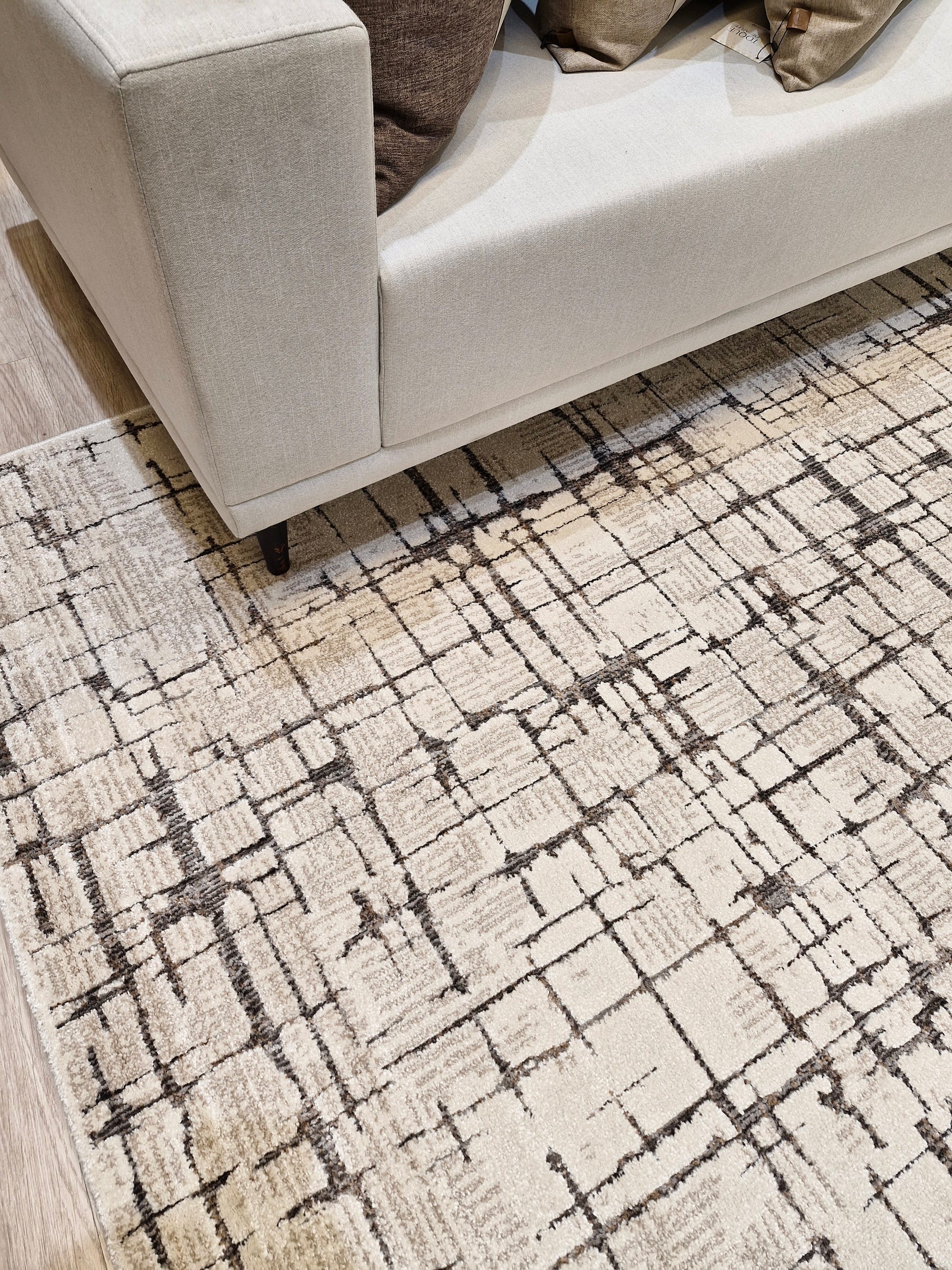 Seu design contemporâneo com padrões geométricos em linhas abstratas cria movimento visual e traz personalidade ao ambiente, enquanto as tonalidades neutras de bege e marrom garantem versatilidade e fácil combinação com diferentes estilos de decoração.