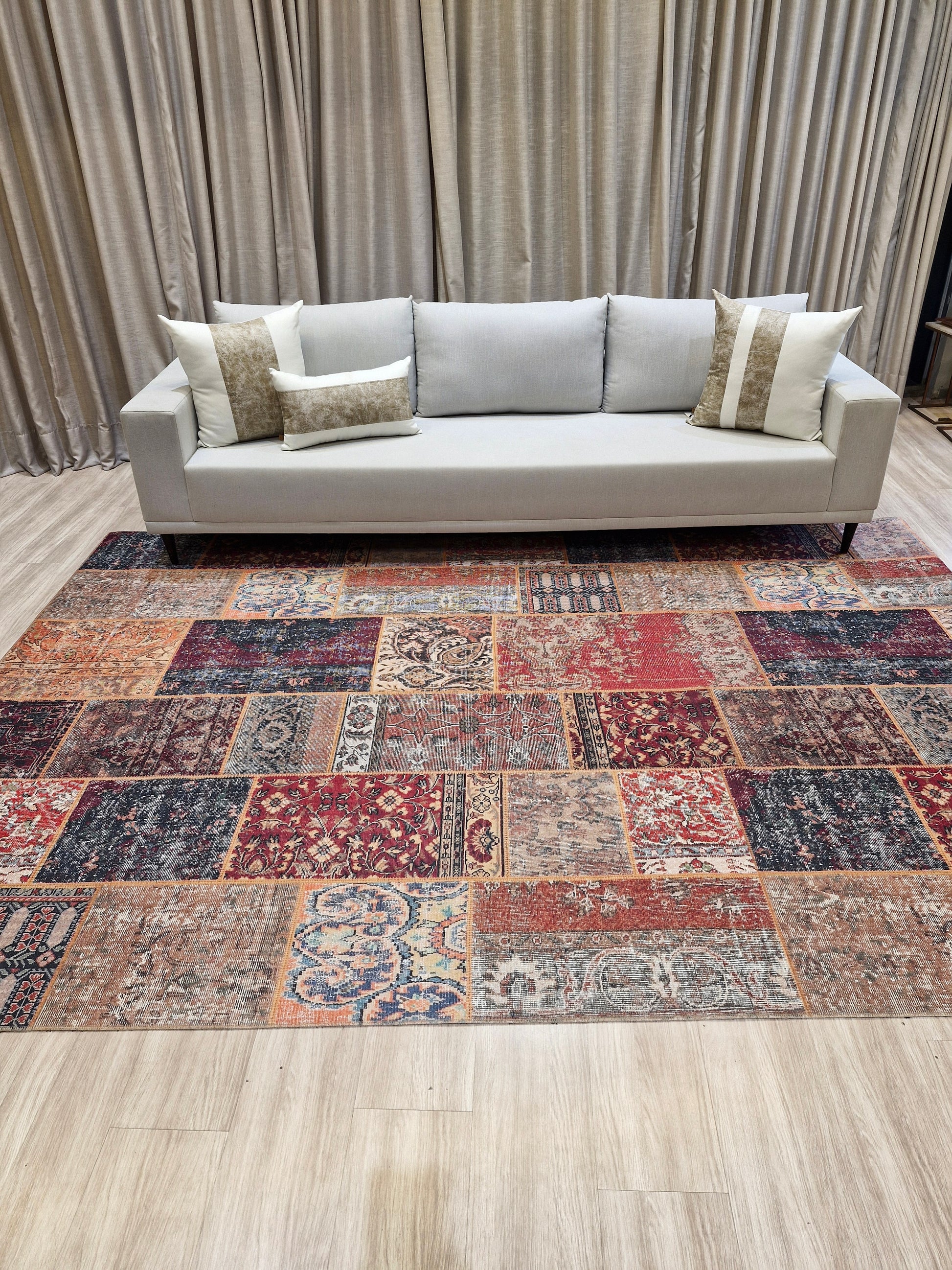O Tapete Egípcio Patchwork Multicolorido é uma peça que une personalidade, praticidade e elegância em um só produto. Importado do Egito, ele apresenta um design exclusivo inspirado no estilo vintage patchwork, com a combinação harmoniosa de padrões clássicos e cores vibrantes como vermelho, azul, terracota e bege, que trazem vida e sofisticação ao ambiente.