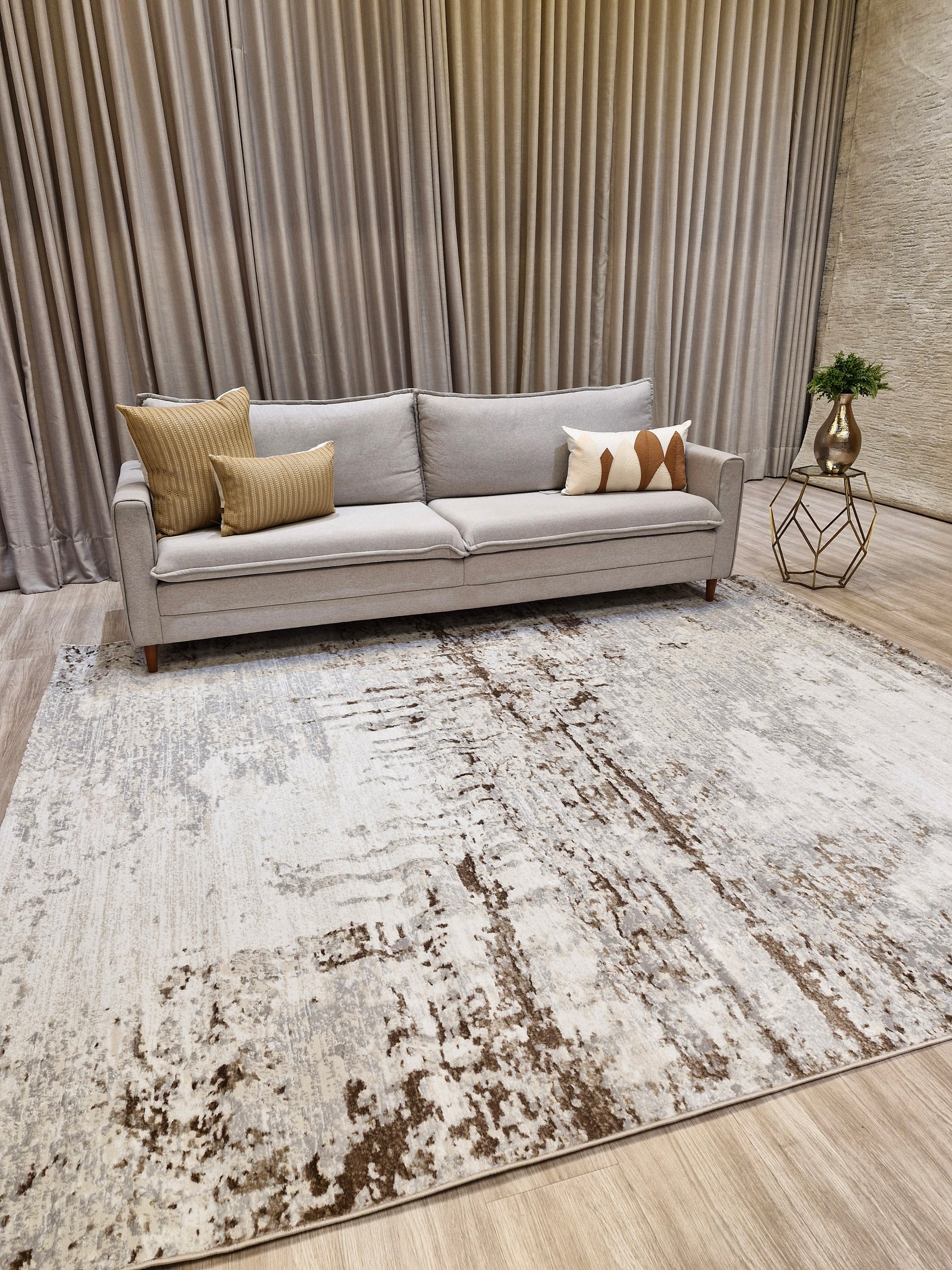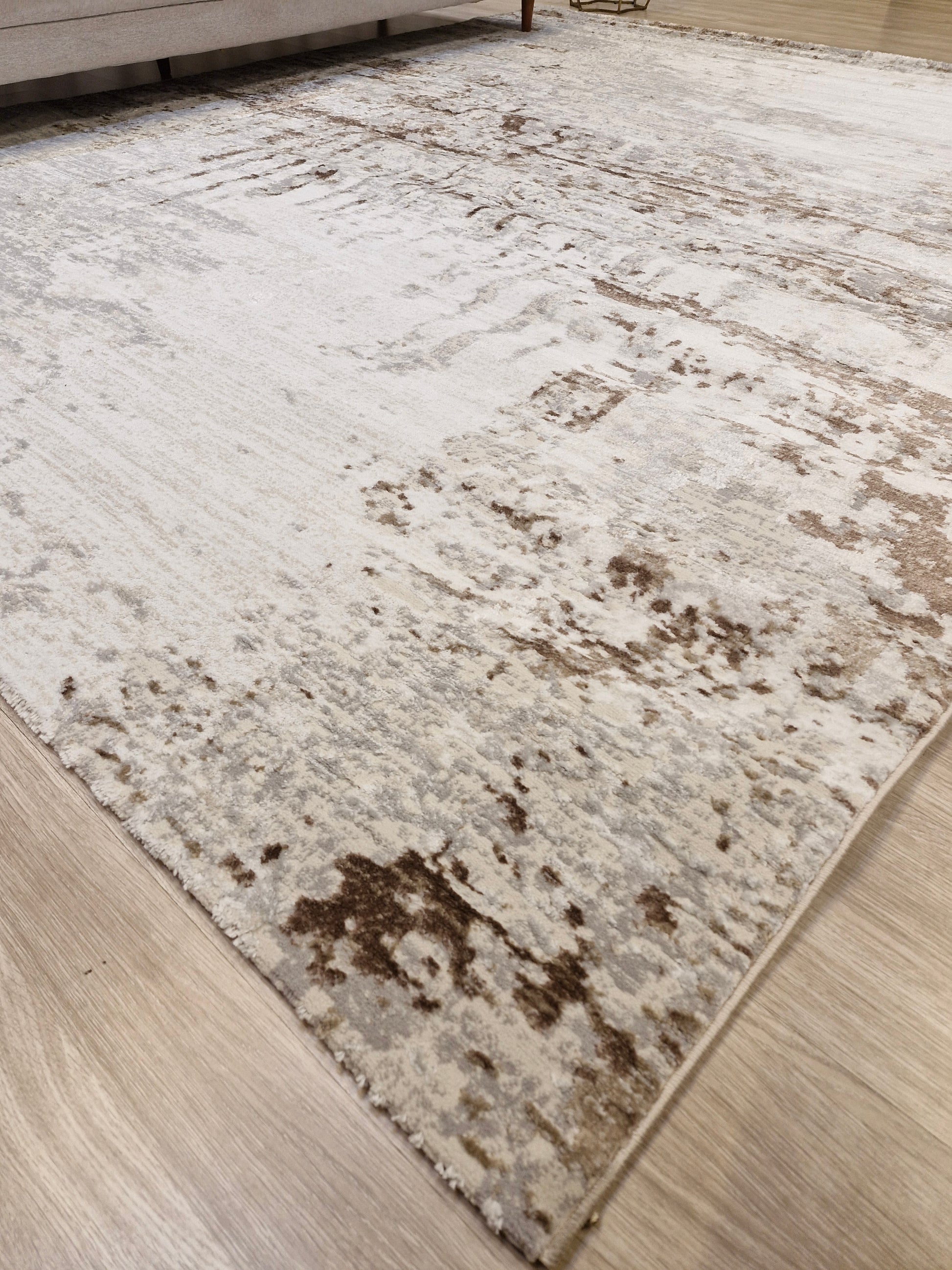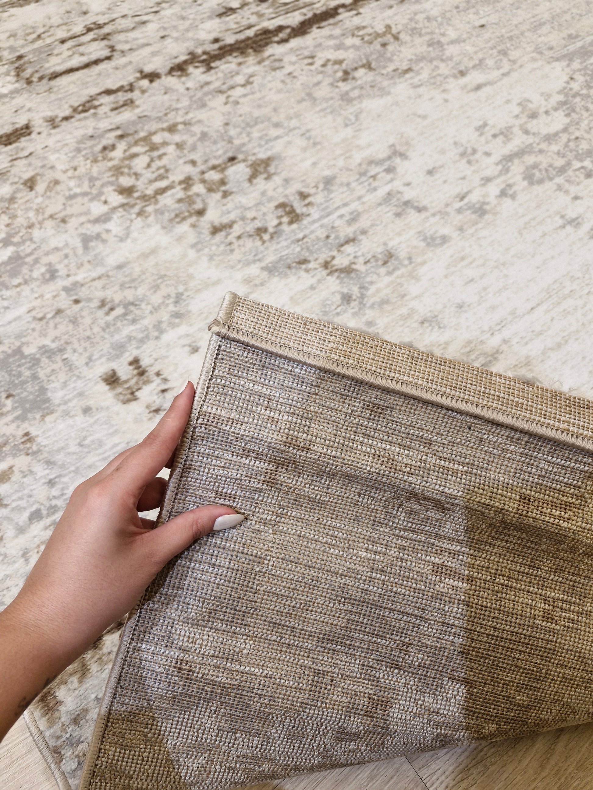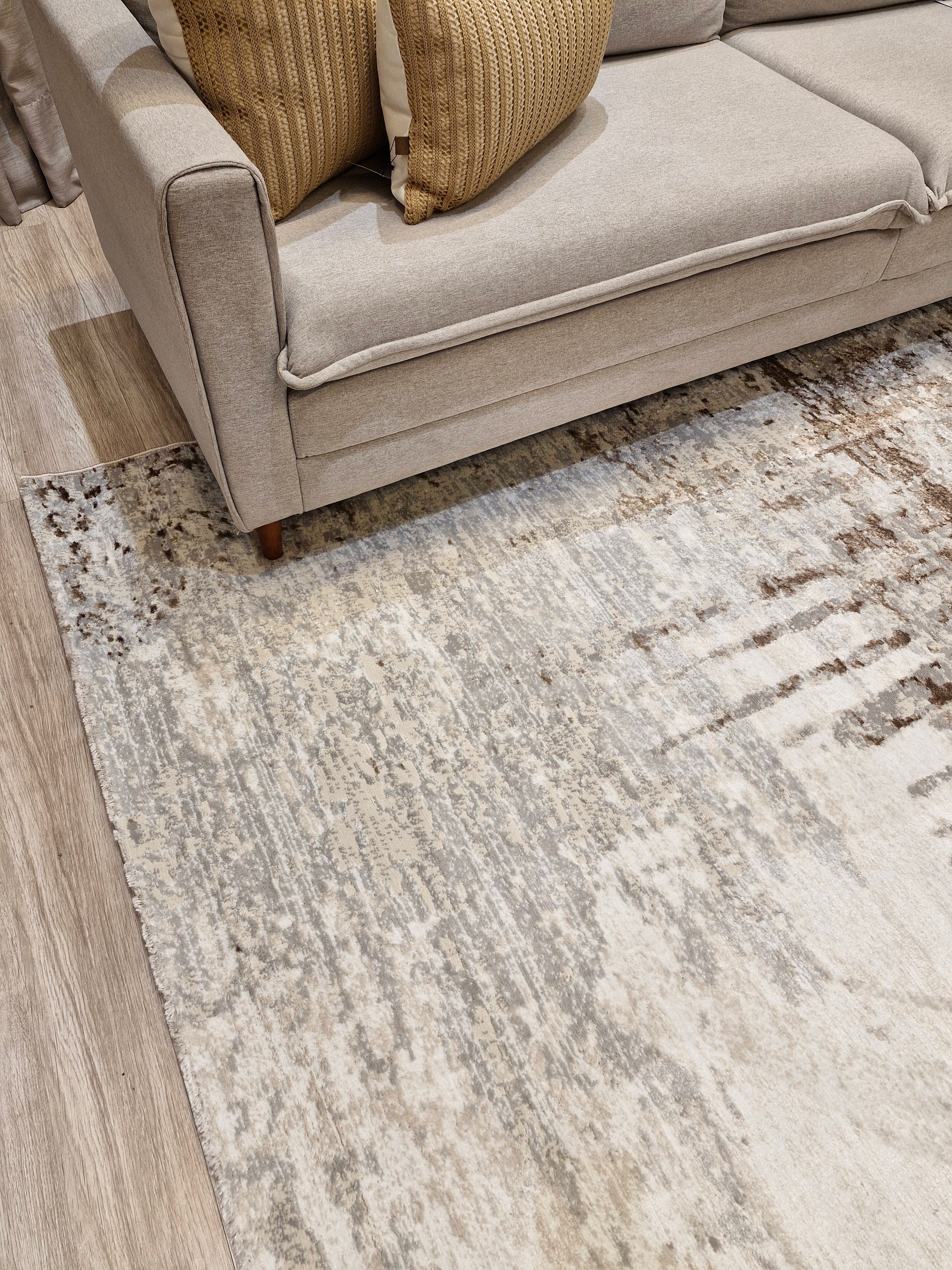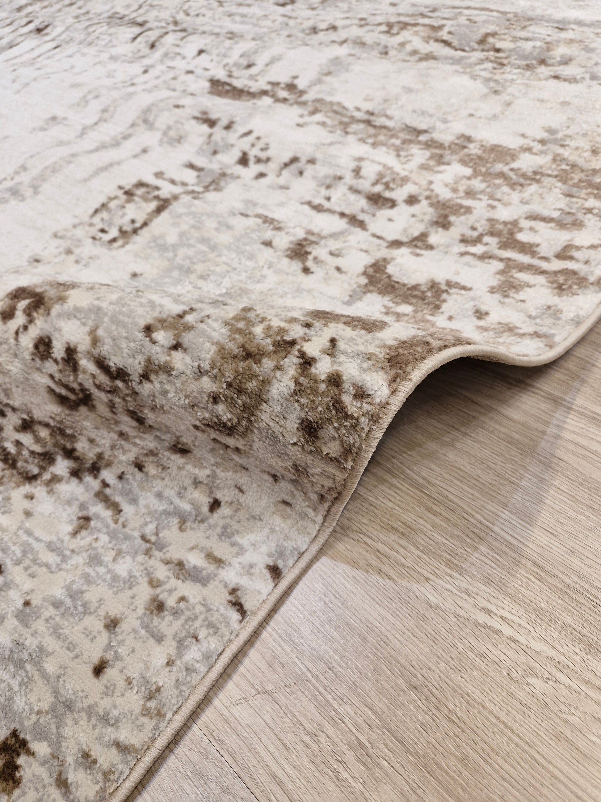 Este tapete turco combina 70% polipropileno e 30% poliéster, garantindo resistência, maciez ao toque e fácil manutenção. Seu design abstrato em tons de cinza, bege e dourado cria uma atmosfera sofisticada e atual.